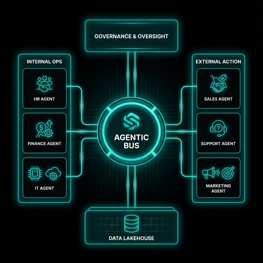 Collaboration is the new frontier. Agents must not be silos. They must form an Agentic Mesh—a composable architecture where a Sales Agent can trigger a Legal Agent to review a contract, who then signals a Finance Agent to approve credit terms. This isn't linear automation; it's a dynamic network. Stexion acts as the architect of this mesh, ensuring that while agents share data and goals, they operate within strict "Human-at-the-Helm" governance rails to prevent "autonomy drift."