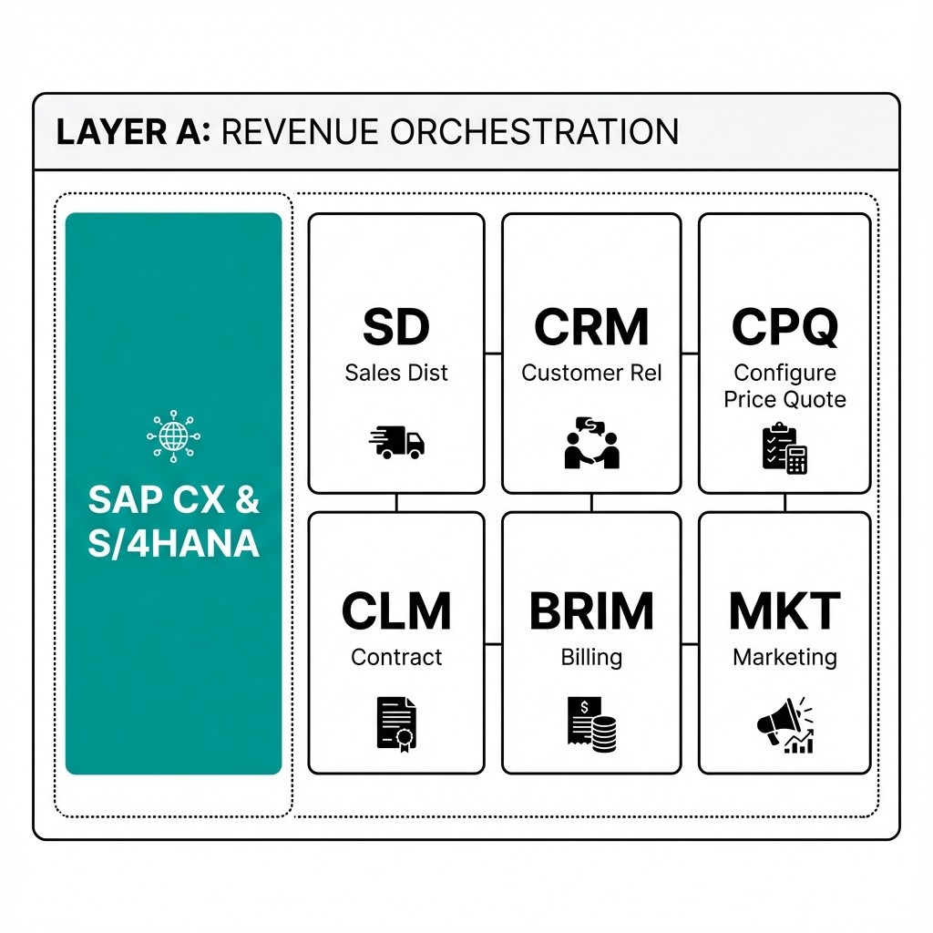 The engine room of the L2C framework is Revenue Orchestration. Anchored by SAP CX and S/4HANA Sales, this layer manages the binding records of the customer relationship. It harmonizes diverse functions such as Sales Distribution (SD), Customer Relationship Management (CRM), Configure-Price-Quote (CPQ), Contract Lifecycle Management (CLM), Billing (BRIM), and Marketing (MKT) into a single source of commercial truth.